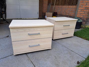 Twee nachtkastjes laatste jaren in schuur gebruikt voor opslag, waardoor de lades niet helemaal netjes meer zijn 52cm breed, 38cm diep, 40cm hoog