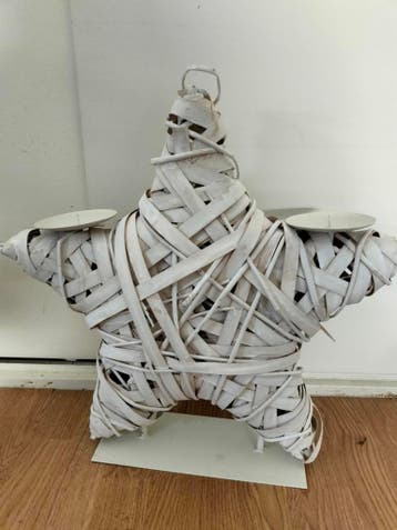 Dit is een witte standaard voor kaarsen in de vorm van een ster. Er zijn twee plekken voor kaarsen. De standaard is gemaakt van gevlochten materiaal en staat op een witte voet.