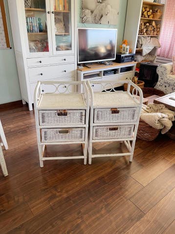 We zijn opnieuw aan het inrichten en hebben geen plek meer voor deze twee rieten kastjes en ze zijn ook niet meer in de beste staat. Ik wilde eerst nog even kijken of we er toch misschien nog iemand b