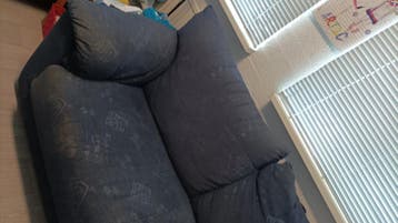 Een hele oude bankstel, 3 zits. De bank is donkerblauw van kleur en heeft een patroon. De kussens zijn vast aan de bank. Het staat in de weg nu ik de kamer moet omgooien. Gebruikt maar zit nog goed. 1
