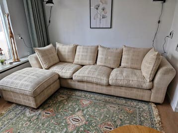 Bankstel met poef crème kleurig bank lengte 275 diep 90 poef 75 bij 75 ik verkoop dit omdat i.v.m nieuw bankstel