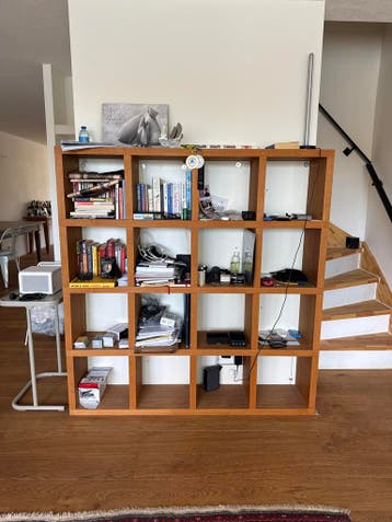 Gratis. Een houten vakkenkast met 15 open vakken. De kast is 150 cm breed en 156 cm hoog. Kan vrijstaand gebruikt worden of aan de muur bevestigd. Can be picked up 22nd of jan, a lift down already org