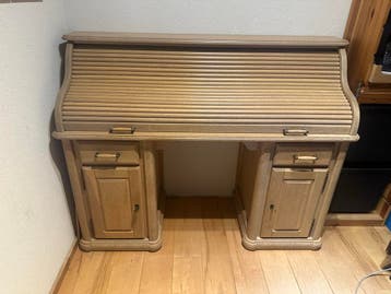 Prachtig vintage rolluikbureau in goede staat. Ideaal voor een klassieke of landelijke inrichting. Voorzien van diverse lades en opbergruimte. Afmetingen: 145 cm breed, 139 cm hoog en 44 cm diep. Een