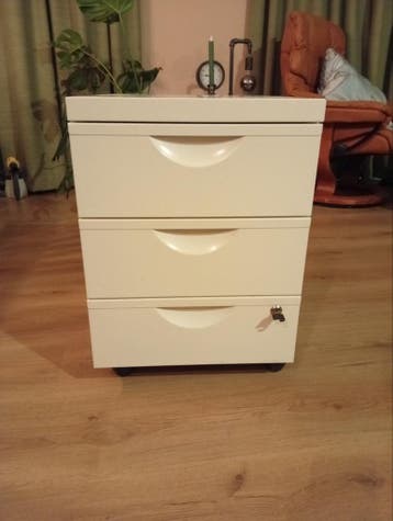 Wit metalen ladekast op rolwieltjes, gaat weg ivm verhuizing. Afmetingen zijn: breedte: 41cm diepte: 51,5cm hoogte: 57cm er zijn lichte beschadigingen op meerdere plekken. De sleutel vergrendelt de on