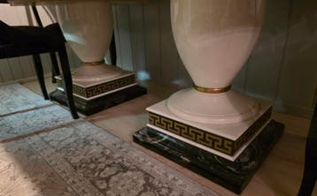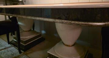 Deze eettafel heeft een licht blad en twee pilaren als onderstel. De pilaren staan op een donkere voet met een patroon. Er is een gouden rand zichtbaar onder het blad. Plus 4 stoelen 100€