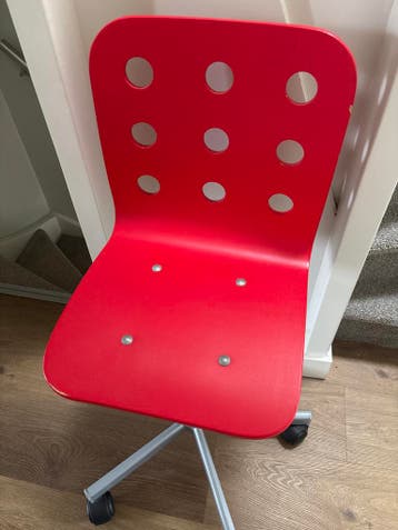 Deze rode kinder bureaustoel van ikea heeft een rugleuning met gaten. De stoel heeft wieltjes en een metalen onderstel. De stoel is gebruikt en nog in goede staat. Enkele gebruikerssporen. Ophalen voo