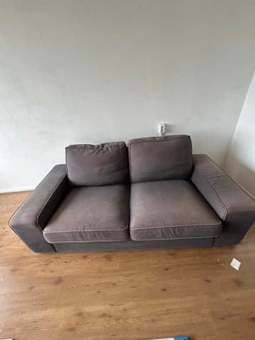 Dit is een grijze bank met twee zitplaatsen. De bank heeft brede armleuningen en losse rugkussens. De stof is donkergrijs met een lichtere bies.