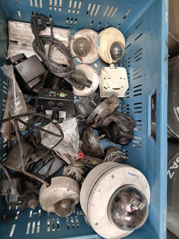 Aangeboden, krat vol defecte beveiligingscamera's. Eenvoudig op te hangen, schrikt altijd af! Zelf even afstoffen...