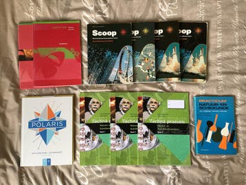 Een uitgebreide collectie natuur- en scheikundeboeken, waaronder 'viadelta anw synthese' (werkboek havo/vwo), 'scoop natuurkunde' (bovenbouw 4 havo, 4/5 vwo, 5 havo), 'techna proev