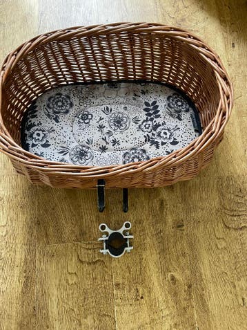 Een rieten mand voor aan het stuur van de fiets. Voor kleine hondjes. 1 Riempje ontbreekt maar gemakkelijk op te lossen. In goede staat. Bevestigingsbeugel aanwezig.