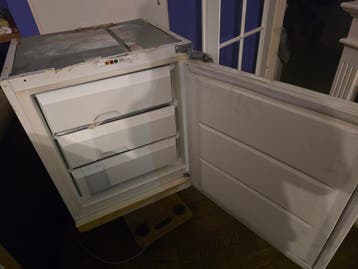 Deze inbouw vriezer is gebruikt, maar werkt nog prima. De afmetingen zijn 59 cm breed, 54.5 Cm diep en 81 cm hoog. Er zitten drie lades in.