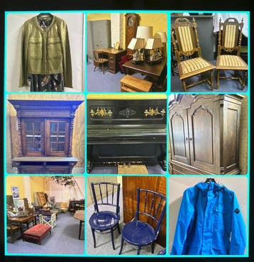 Kasten tafels stoelen lampen schilderijen kleding speelgoed boeken