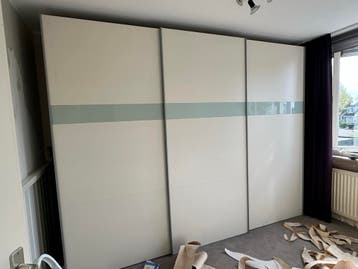 Kledingkast met schuifdeuren, planken en hangruimte. De kast is al uit elkaar gehaald, behalve de deuren. Zorg voor een ruime auto of busje voor het ophalen. 305 Breed, 235 hoog, 63 diep. Zo snel moge