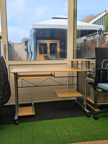 Dit is een bureau met een licht houten blad en een metalen frame. Het heeft een uitschuifbaar blad voor een toetsenbord en een extra plankje onder het bureau. Ook zit er een verhoging op voor een moni