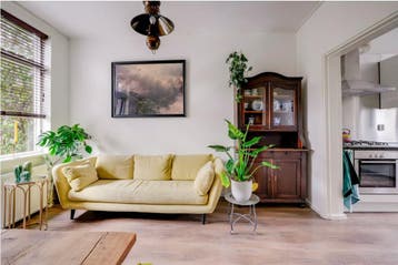 Deze stijlvolle driepersoonsbank is bekleed met een zachte gele fluwelen stof en zit erg comfortabel. De bank is in gebruikte staat en kan wel nog even een schoonmaakbeurt gebruiken. Past perfect in e