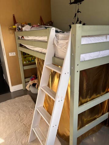 Houten hoogslaper met een oprolbare houten lattenbodem. Het bed is groen geschilderd, maar kan een nieuw verfje gebruiken. Het trapje is wit. Je kan het bed ook laag zetten door de poten eraf te halen