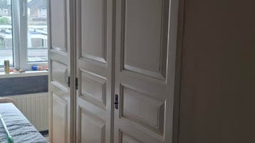 Deze ruime 3-deurs kledingkast biedt praktische opbergruimte met zowel hang- als legmogelijkheden. De kast is gebruikt en heeft wat verkleuringen, maar is nog steeds functioneel en kan met een likje v