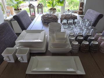 Serviesset. Niet evenveel stuks van alle onderdelen meer aanwezig. In één van de grote borden zit een scheur. Van de grote hapjesschaal is een hoekje afgebroken. Zie foto. Voor de rest zijn alle onder