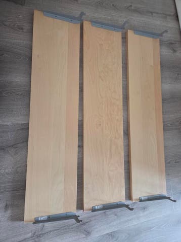 Drie planken met plankendragers. De planken zijn 129 cm lang en 28 cm diep. Ze zijn gratis af te halen.