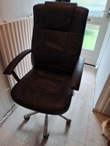 Zwarte bureaustoel met armleuningen. De stoel heeft wieltjes en een metalen onderstel. De zitting en rugleuning zijn bekleed.