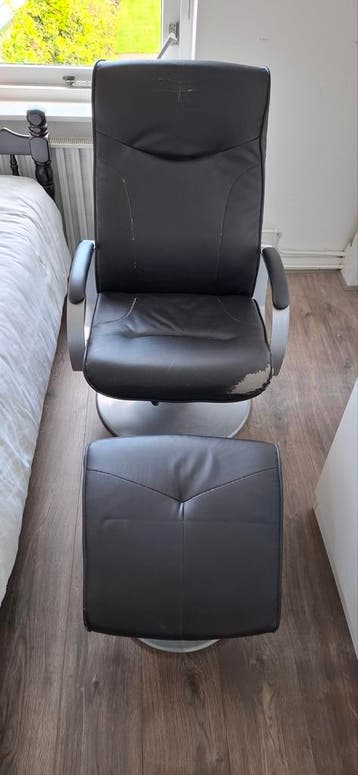 Ligstoel met bijpassende voetensteun. Stoel is verstelbaar in zitten naar relaxed liggen. De stoel is zwart en heeft een metalen onderstel. Er is wat slijtage zichtbaar op de zitting en rugleuning.