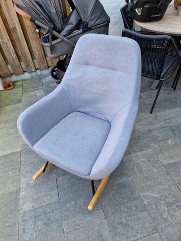 Een grijze schommelstoel met houten schommelsledes. De stoel heeft een lichte vlek op het zitvlak, zoals te zien op de foto. De bekleding is van stof.