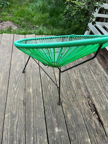 Acapulco draadstoel in een opvallende groene kleur, voor buiten of binnen. De stoel is helaas kapot, maar zit nog comfortabel. O ja, het is het model dat wel lekker zit. Bij sommige zit je letterlijk