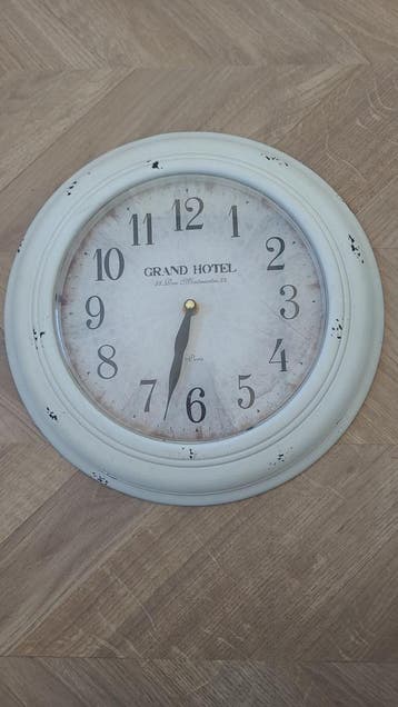 Deze klok is gratis op te halen. Het is een ronde klok met een witte rand en zwarte cijfers. Er staat 'grand hotel 58. Rue montmartre. 58 Paris' op de wijzerplaat.