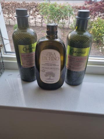 Gratis lege olijfolieflessen. Een dopje is wat beschadigd, maar het glas nog gaaf. Leuk voor de sfeer/ decoratie/ inrichting. Of misschien om opnieuw te vullen? Kon het niet over mijn hart krijgen om
