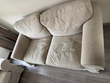 Twee tweezits banken met lichte bekleding. De banken hebben een klassieke uitstraling en zijn geschikt voor twee personen elk. Ze zijn gebruikt en hebben wat lichte gebruikssporen. Gratis op te halen
