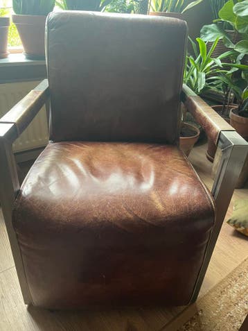 Wegens verandering van interieur,gratis op te halen,deze fijne stoel,bekleed met echt leer. Zitten kleine wieltjes onder.