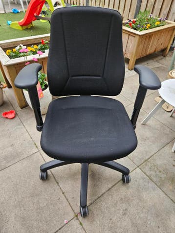 Nette en comfortabele zwarte bureaustoel, ideaal voor thuiswerken of op kantoor. De stoel is verstelbaar in hoogte en heeft comfortabele armleuningen. In goede staat en klaar voor een nieuwe eigenaar.