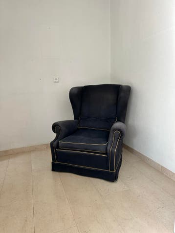 Comfortabele donkerblauwe stoffen fauteuil met gouden bies. Ideaal voor een gezellige leeshoek of als aanvulling op uw zithoek. De fauteuil is in goede staat en biedt uitstekend zitcomfort.