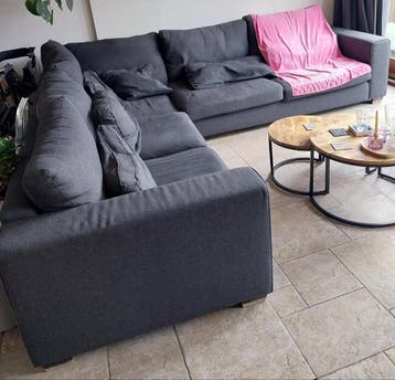 Hele grote hoekbank. Kleur antraciet van de hoek is het zitkussen ingezakt. Helemaal heel. Ligt heerlijk. Hoezen kunnen eraf. 2 Delen. Wij hebben een kat. Dus kunnen haren op zitten. Moet zo snel moge