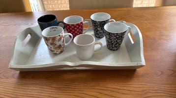 Hoogste tijd weer eens op te ruimen. Houten dienblad met 6 kopjes
