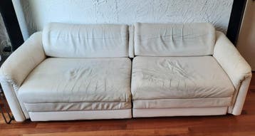 Beige sofabank met opbergruimte de conditie is gebruikt. Het leer is beschaagdig, maar het bankstel is nog in heel goed conditie.