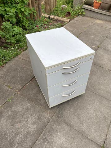 Dit is een kastje op wielen met drie lades. De bovenste lade heeft een indeling voor kleine spullen. De afmetingen zijn breed 43 cm, diep 55,5 cm en hoog 58,5 cm.