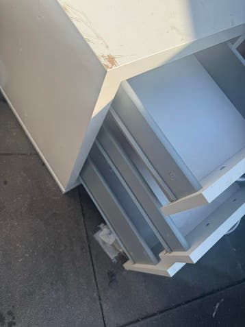 Handig wit ladeblok met drie laden, ideaal voor onder een bureau of als extra opbergruimte. Het blok staat op wielen, waardoor het gemakkelijk te verplaatsen is. Het heeft wel wat gebruikssporen aan d