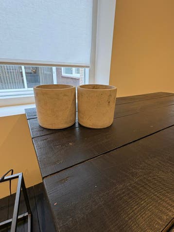Een gevarieerde collectie van graus producten, waaronder twee stijlvolle potten, een vrolijk gestreepte vaas en een handig roze etui. Perfect voor decoratie of dagelijks gebruik. De potten en vaas zij