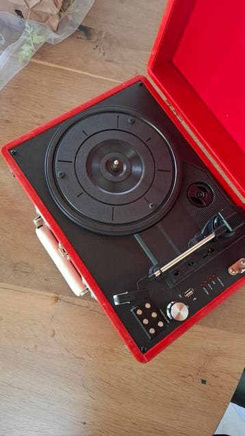 Deze rode platenspeler zit in een koffer. Hij heeft ingebouwde speakers. Er zitten knoppen op voor volume en andere instellingen. Hij staat al lang stil en ik ben de voedingskabel kwijt dus ik durf ni