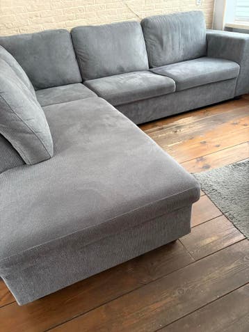 Gebruikte hoekbank met de hoek aan de linkerkant als je ervoor staat. In het gleufje is hij een beetje ingezakt, maar op de rest van de zittingen zit hij heerlijk. (Nu gratis af te halen) wel zelf oph