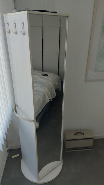 Dit is een witte carrousel kast met een spiegel aan één kant. De kast heeft ook planken en haken aan de zijkant. Hij draait rond op een voet.