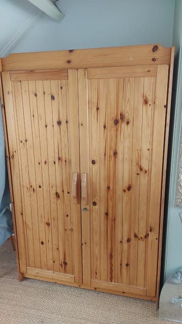Deze grenen kledingkast heeft twee deuren. Binnenin is er een deel met planken en een deel met hangruimte. De kast is gemaakt van grenenhout.