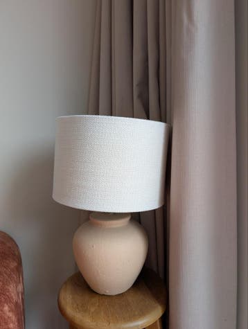 Een tafellamp met een geschilderde voet en een witte stoffen kap. Kap heeft neiging om wat scheef te gaan staan verder prima staat.
