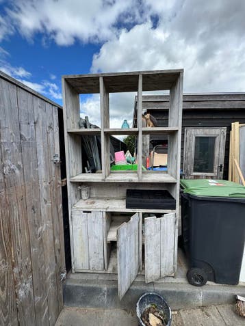Deze steigerhouten kast heeft meerdere open vakken en drie deurtjes aan de onderkant. De kast is gemaakt van steigerhout en heeft een rustieke uitstraling. Hoogte 220cm breedte 120cm diepte 38cm.