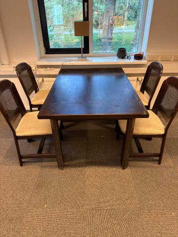 Een donkerbruine eettafel met vier bijpassende stoelen. De stoelen hebben een rieten rugleuning en een stoffen zitting. De tafel en stoelen zijn gebruikt.