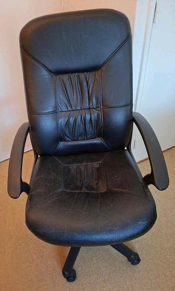 Comfortabele zwarte bureaustoel, ideaal voor thuiswerken of op kantoor. De stoel is verstelbaar en biedt goede ondersteuning. Zoals te zien op de foto's, heeft de stoel gebruikssporen, met name op