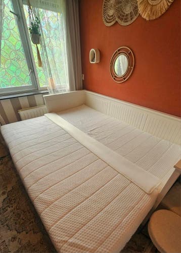 Twee matrassen met verbindingsstuk, samen 200 x 160 cm. Per stuk zijn de matrassen 200 × 80 cm beide matrassen zijn in goede staat en kunnen direct gebruikt worden. Prijs: €50 totaal alleen ophal