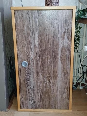 Stevig opbergkastje stond naast mijn bureau. Ivm toekomst kleiner wonen mag deze weg. Deurtje is met plakplastic opgepimpt naar mijn eigen smaak. 82 Cm hoog 45 cm breed 43 cm diep gratis !!! Ophalen i
