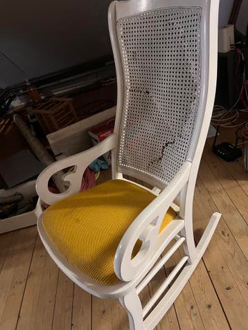 Gratis af te halen voor iemand die handig is. Het riet van de rugleuning is gescheurd maar verder is de stoel in goede staat. Is door iemand die handig is goed te maken.